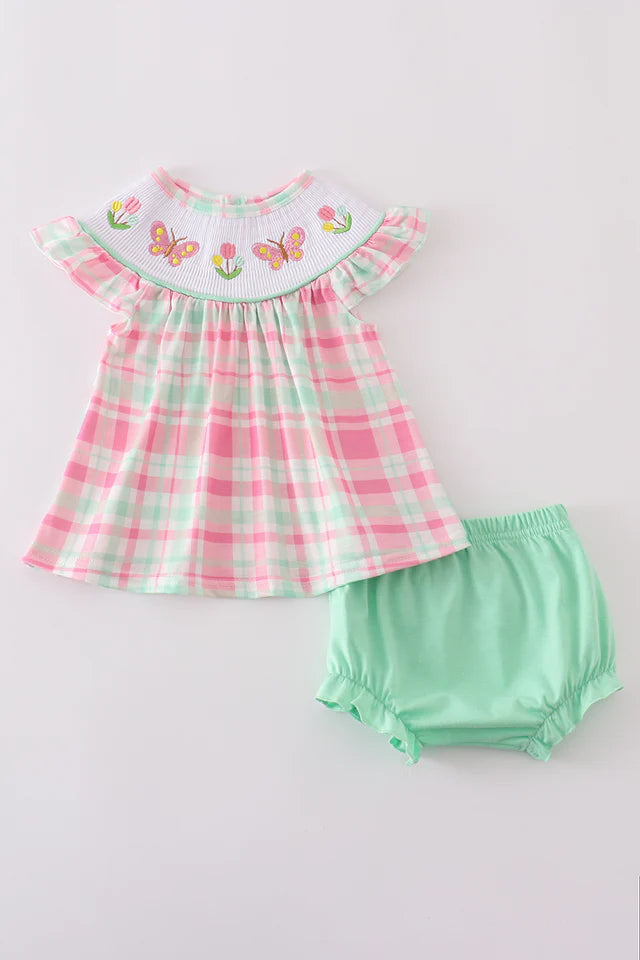 Pink floral butterfly embroidery smocked plaid bloomer set