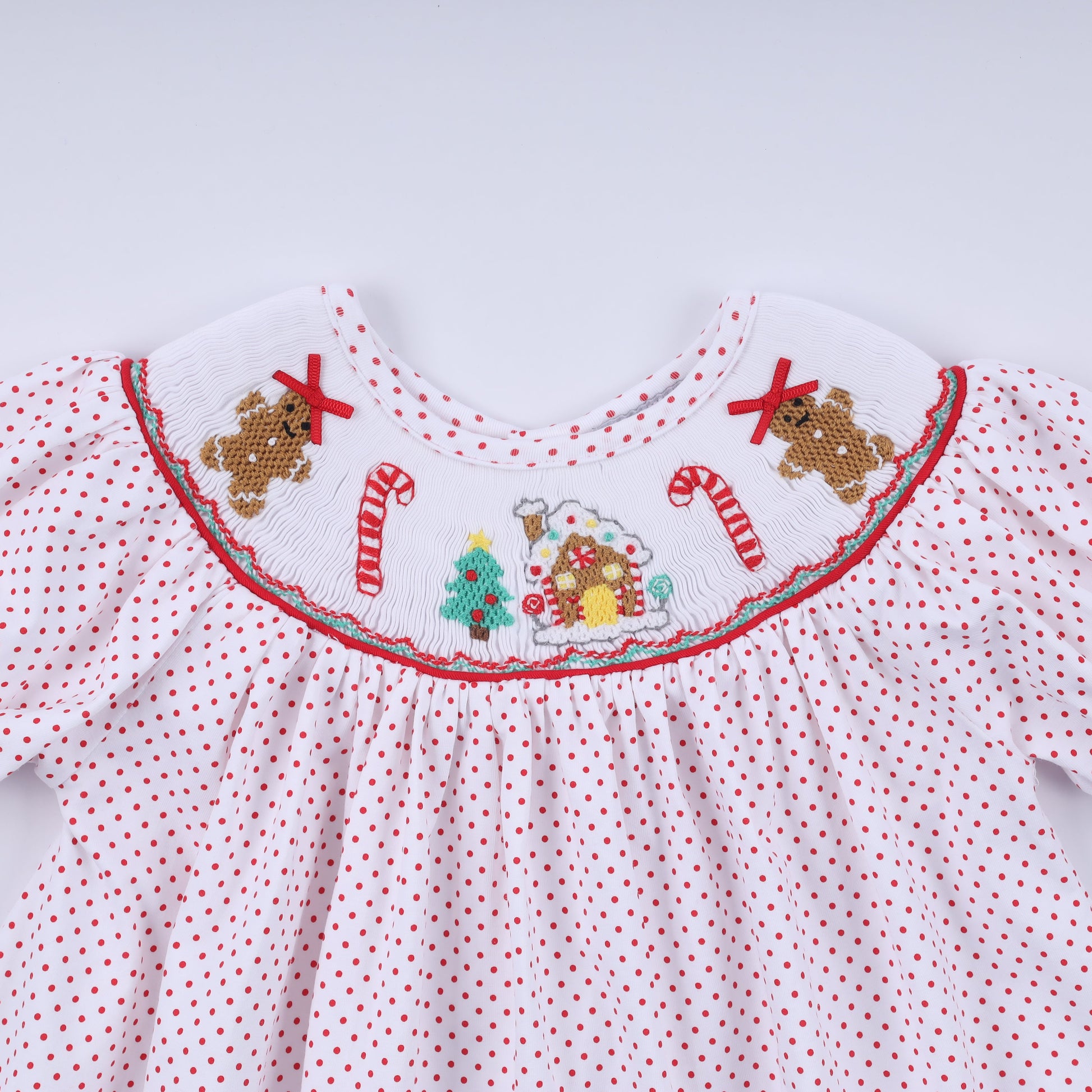 Red gingerbread hand smocked ruffle pants set